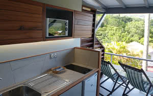 Le studio supérieur vue mer se compose d'une chambre principale climatisée ainsi qu'un coin cuisine entièrement équipé sur une très agréable terrasse donnant sur la mer de la plage de Grande-Anse.